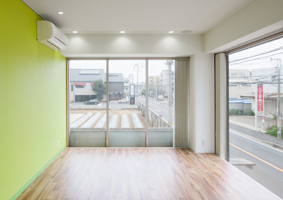 三面ガラスに囲まれ、 交差点に建つ集合住宅の2階にテナントとして入居する 歯科医院のインテリアデザインです。 非常に視認性の高い事から、 用途的にインテリア自体が広告となるよう 「カラー」をコンセプトとし、壁一面をグリーンとしています。 この明るいグリーンは、街に対して医院の存在をアピールすると同時に、 来院者にとって親しまれやすいカラーとしています。 (撮影 新澤 一平)